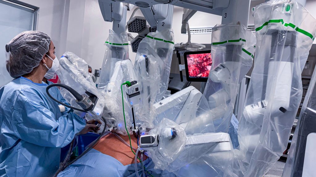 El sistema Da Vinci es una plataforma quirúrgica que traduce los movimientos del médico en acciones exactas dentro del cuerpo. El especialista maneja el robot desde una consola con visión tridimensional de alta definición, lo que facilita el acceso a estructuras profundas del tórax con total control y estabilidad.